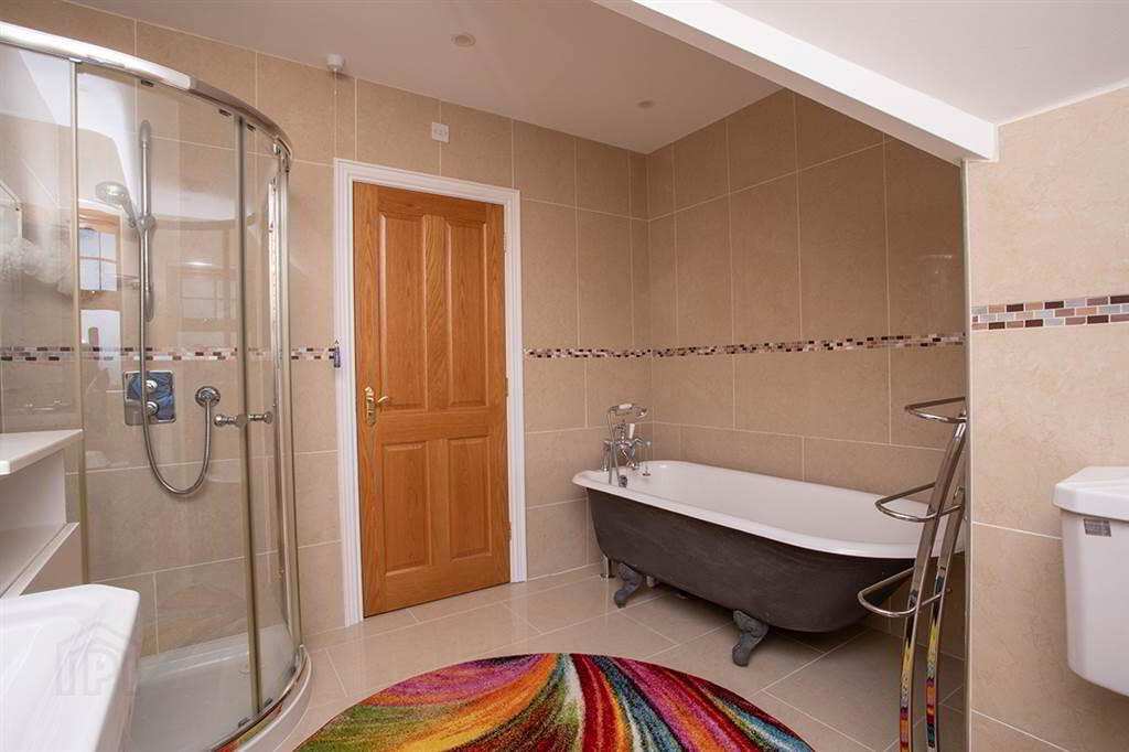 BATHROOM 9'8" X 9'10" WHITE BATHROOM SUITE COMPRISING WASH HAND BASIN, WC, FREE STANDING CAST IRON ROLL TOP BATH & SEPARATE SHOWER CUBICLE. TILED WALLS & FLOOR.