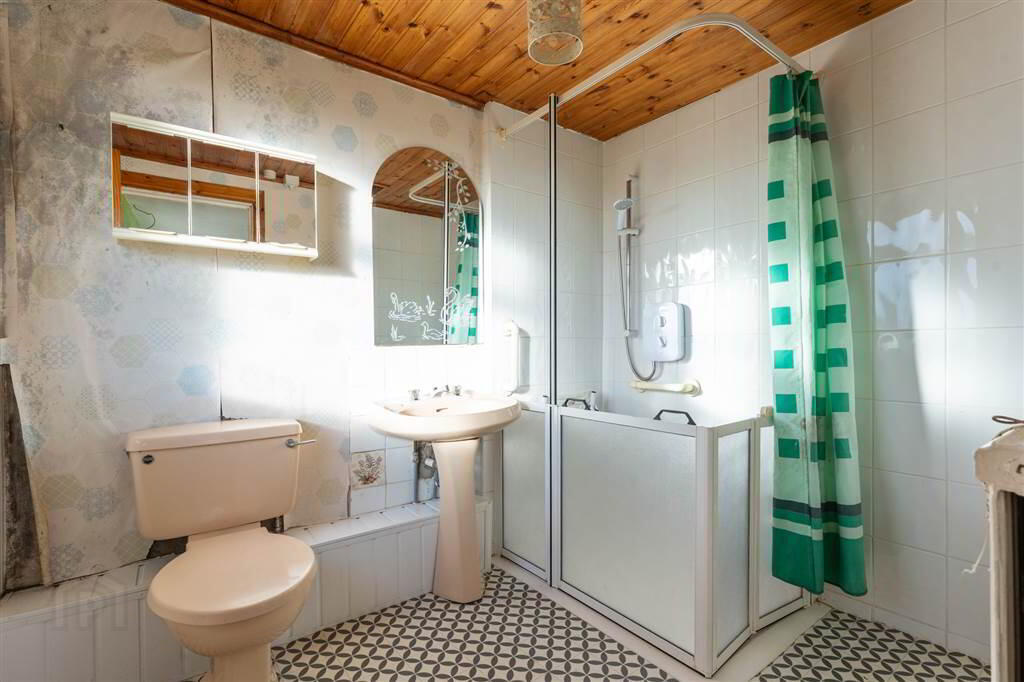 Large family bathroom with a walk-in disabled friendly Redring pure electric shower, wc and wash hand basin. Tiled floors and walls with rear aspect. Wood panel ceiling and access to roof space.