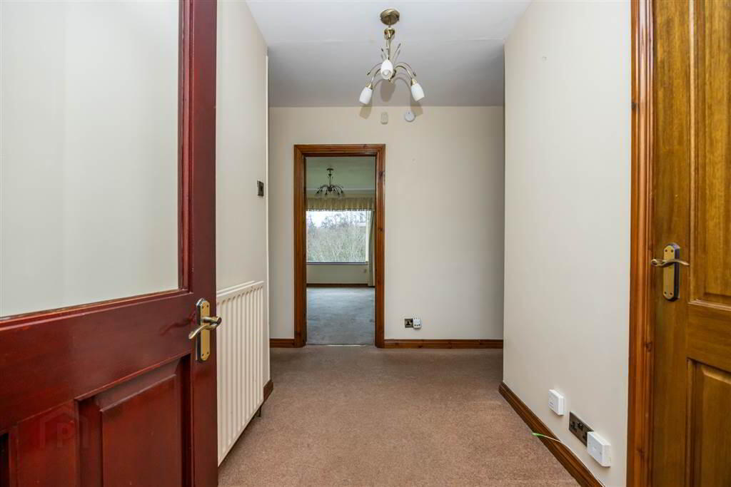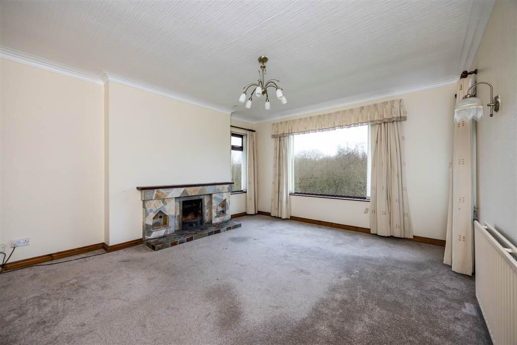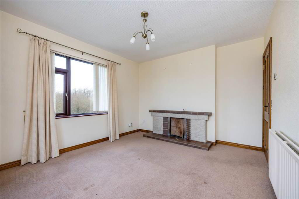 Large living area with carpeted flooring and views from side and rear aspects over countryside. Open fire with scrabo stone style surround, tiled hearth and mahogany mantle. - BEDROOM (1):