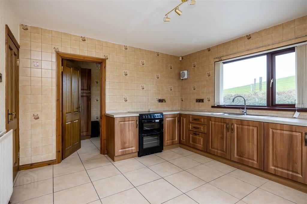Open plan kitchen/dining room with low level storage and space for freestanding electric cooker. Tiled flooring and walls. Access to utility and separate w.c. - UTILITY ROOM: