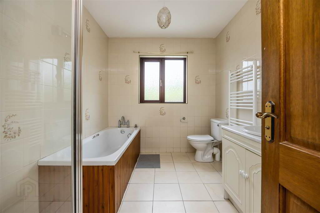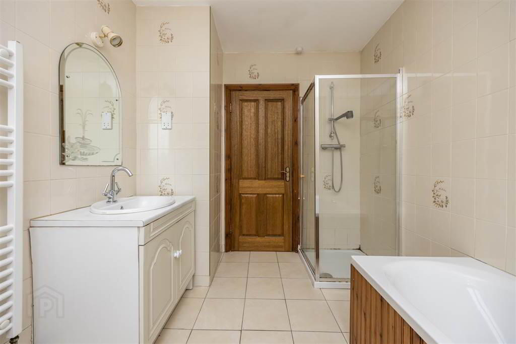 Large family bathroom with fully tiled walls and flooring. Chrome towel rail. Sink with storage, bath and shower cubicle. - BEDROOM (3):