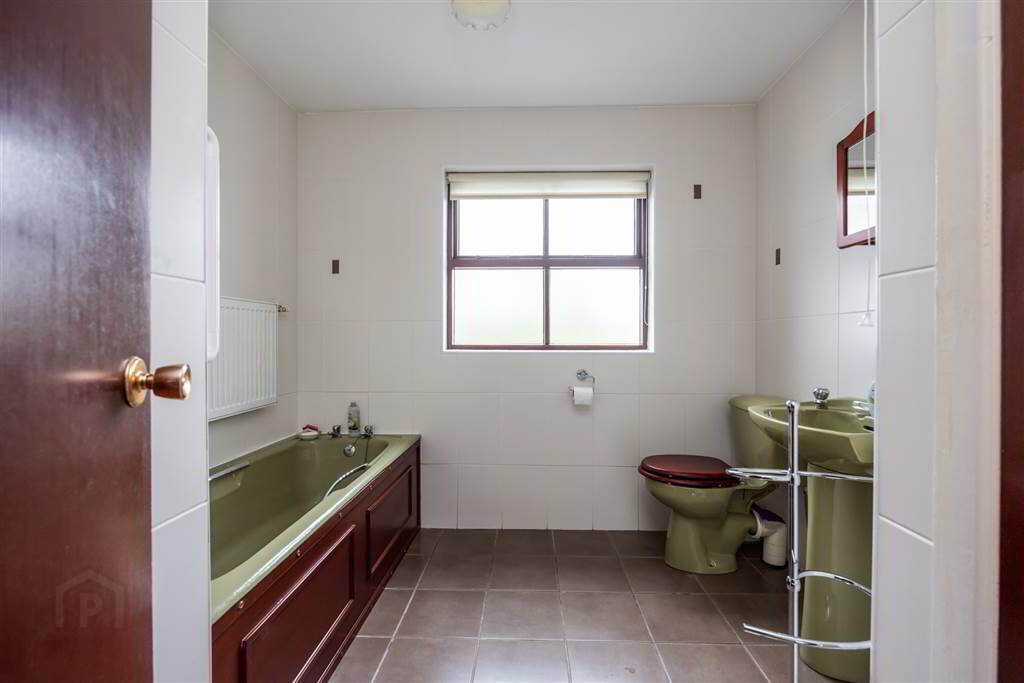 Family bathroom with tiled floors and walls, bath, full pedestal sink and separate shower cubicle with thermostatically controlled shower. Access to hotpress. - BEDROOM (3):