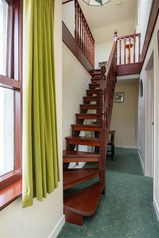 - Carpeted flooring with open tread mahogany stair case to upper floor.