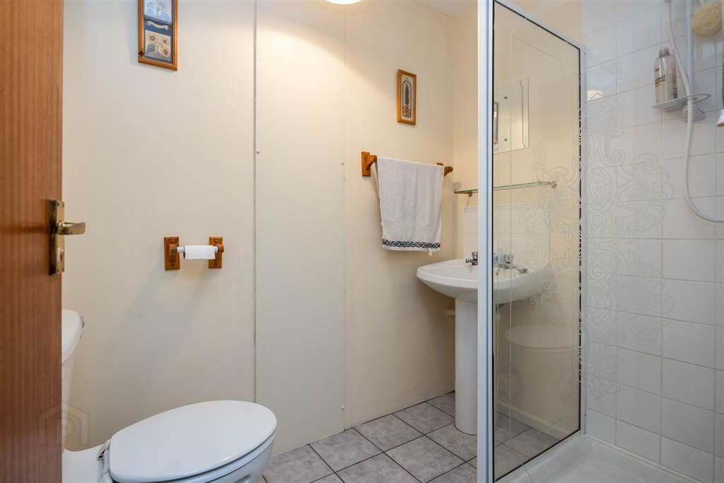 Tiled flooring with wc, full pedestal sink and shower cubicle fitted with a Redring Plus Electric shower. - BEDROOM (5):