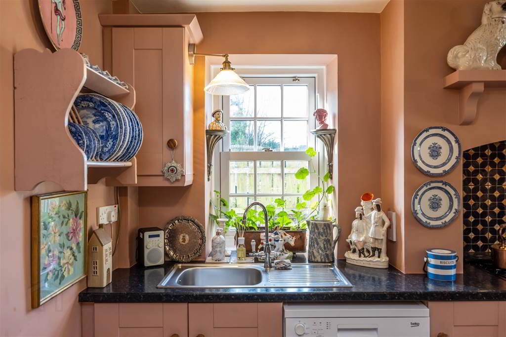 A cosy inviting space with solid wooden flooring throughout, perfect for quiet evenings and featuring the kind of warmth & features only a period home can provide. Enjoying both front & side aspect allowing an abundance of natural light. Open fire with period effect fire surround and tiled hearth. - KITCHEN: