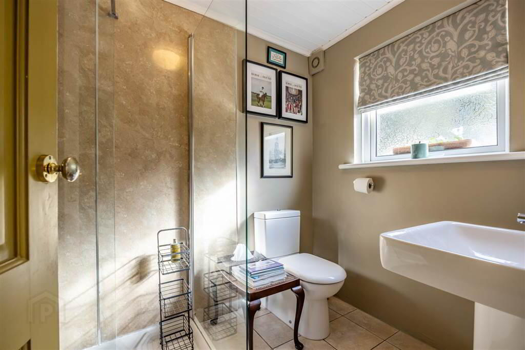 A well appointed downstairs shower room with tiled flooring. Large walk in style shower enclosure with thermostatic shower. White suite with full pedestal WC and sink. Chrome towel radiator. - BEDROOM (1):