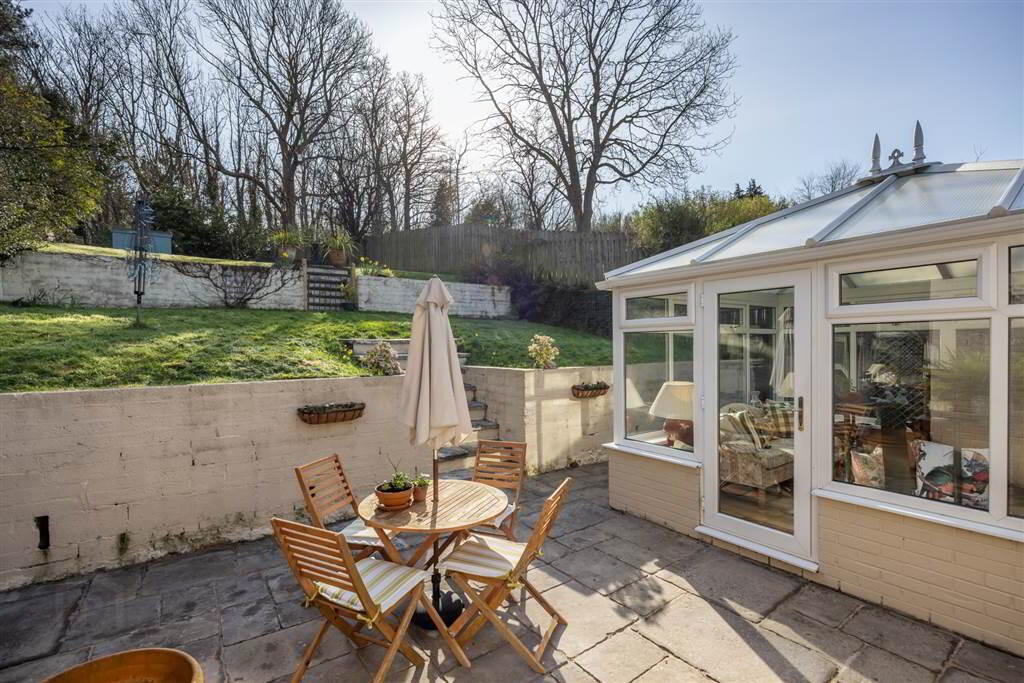 - A private rear, paved patio area, ideal for entertaining, accessed from both the conservatory & rear hallway. Steps lead up to a large, elevated, tiered, private rear garden with mature trees & shrubs. Additional paved patio area to the side of the property. Boiler House.